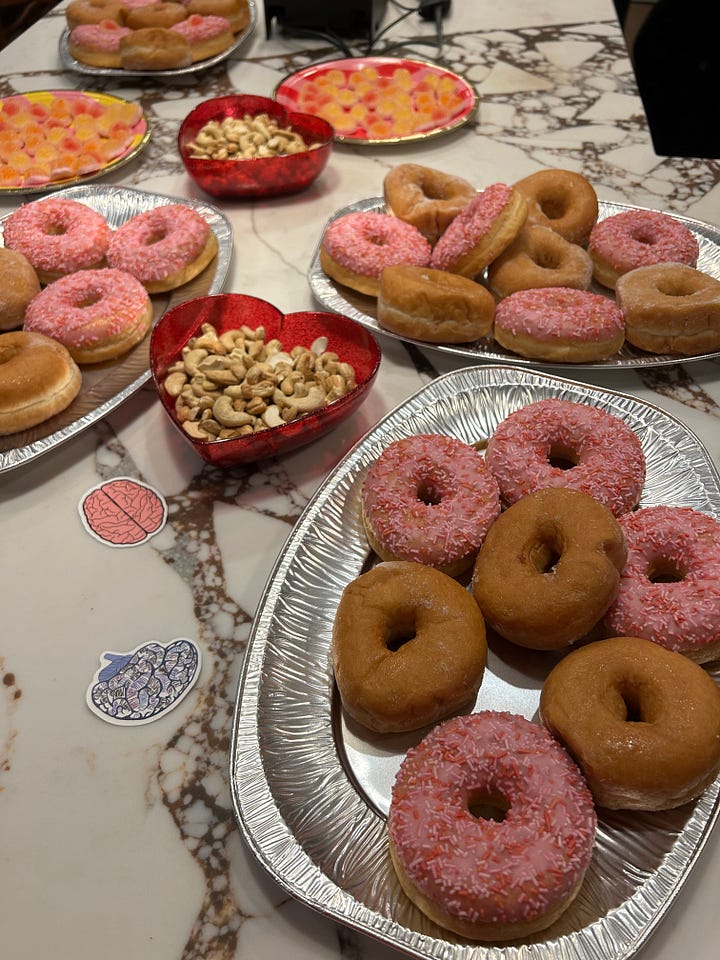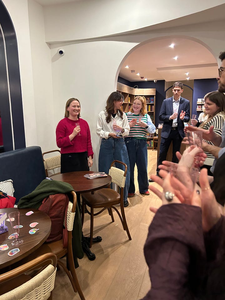 I hosted a dreamy book launch for family and friends at Fable & Falcon, a bookshop cafe in North London that you should totally check out, not only for their great selection of books but drinks and pastries, too. We had Love and Other Brain Experiments-themed snacks (donuts, cashews — iykyk 😏, and brain-shaped sweets), pink glittery drinks, friends visiting from close and afar, and altogether a fabulous time.
